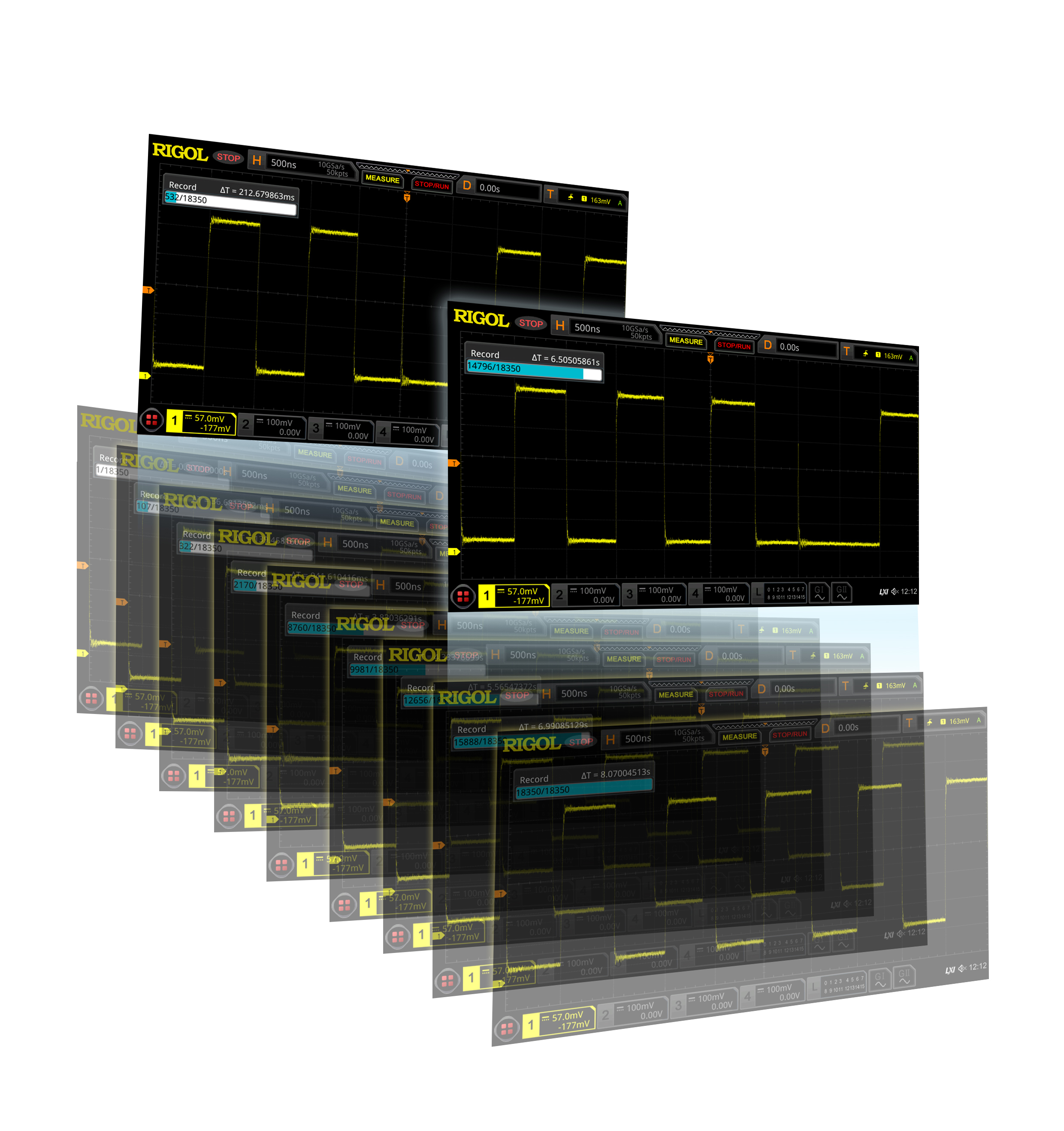 The memory depth is one of the key specifications of the oscilloscope. However, whatever high the memory depth, it cannot be guaranteed that all the signals that users are concerned about can be captured in one time. This is especially true for the occurrence of the infrequent signals during debugging design or locating specific events from the long captured complicated signals. In addition, the long memory depth will be bound to reduce the response time for the oscilloscope. The hardware waveform recording and playback function can address this issue. MSO8000A series provides ceaseless recording and playback for a maximum of 450,000 frames of hardware real-time waveforms. This specification is second to none in the industry. The hardware waveform recording function adopts the segmented storage technology. With the technology, you can set the trigger conditions to make a selective choice in capturing and saving the signals that you are interested in, then mark the time on the signal. This has not only ensured the high capture efficiency, but also prolonged the overall observation time for the waveforms. The hardware waveform playback function enables you to have sufficient time to take a careful view and analysis of the recorded segment of the waveforms. |