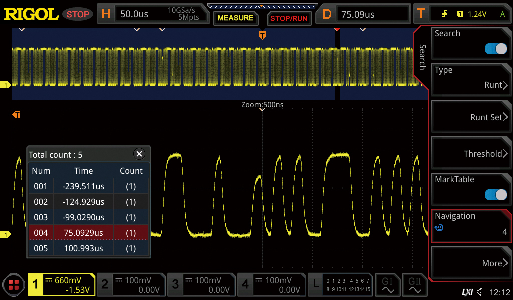 ![]() As the memory depth of the oscilloscope becomes higher, locating a specific event from the thousands of captured complicated waveforms is a tedious task that requires much time and efforts. The waveform search function can help you quickly locate the concerned events and make a mark. Then, you can use the specific navigation keys to quickly locate the marked signal and make measurements easily. The search conditions for waveform search include edge, pulse, runt pulse, and slope. The searched event information is displayed in the form of a list. |