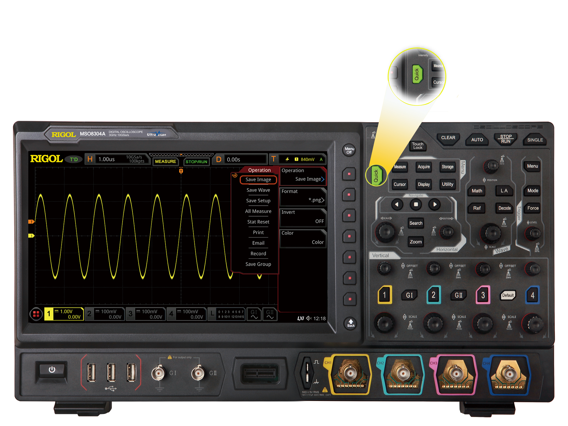 ![]() MSO8000A series has a dedicated Quick key on the front panel, enabling you to customize the function of the key and complete the commonly used operation quickly. With the customized setting of the Quick key, you can quickly capture the screen image, realize waveform saving, setup saving, all measurement, reset measurement statistics, reset pass/fail test statistics, waveform recording, send the mail, printing, and group saving. |
