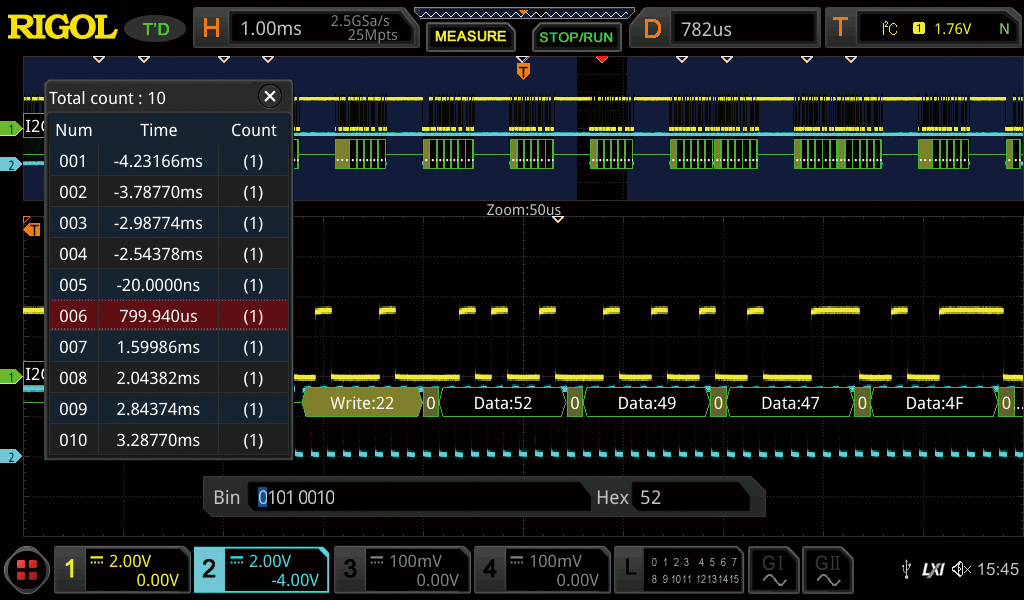 The auto measurement is the basic tool for engineers to make a rapid analysis of the signals, and it requires more efficient measurement process and accurate measurement results. MSO8000A series supports hardware full memory auto measurement, provides measurements of 41 waveform parameters, supports displaying the statistics and analysis of the measurement results for 10 items. In addition, the auto measurement function also supports auto cursor indicator and measurement range selection. You can also set the threshold for each measurement source independently, making the waveform measurement more flexible. To get a quick view about how to make measurements, we provide you with detailed help documents and diagrams to better illustrate the measurement methods for each item. Based on the different data sources, auto measurement consists of two modes: Normal and Precision. In Normal mode, the data volume increases from 1 k to 1 M, realizing the optimization of the basic measurement function. In Precision mode, the oscilloscope provides hardware full-memory auto measurement, greatly improving the precision of the waveform measurement. With the 500 Mpts memory depth, any measurement for the item can be completed within 1.5 s, addressing the problem of long observation of the signal for measurement perfectly. |